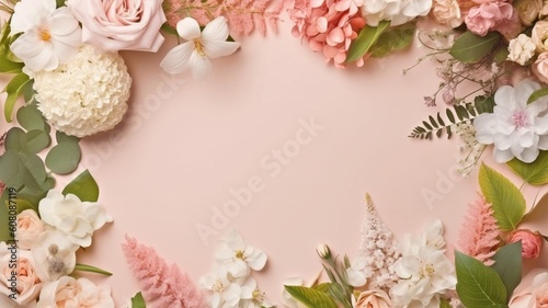 Inventive flower and leaf arrangement on a paper card note. Lay flat. Nature-based idea. GENERATE AI