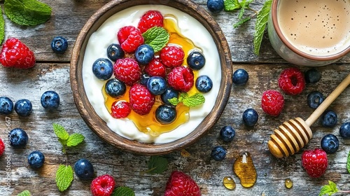 breakfast, yogurt, berry, honey, rustic, wooden, table, healthy, fresh, vibrant, morning, creamy, gold, glisten, mint, dipper, steaming, hot drink, cosy, bright, inviting, wellness, vitality, raspberry, strawberry, blueberry, wooden table, morning light, natural light, healthy lifestyle, alimentary, fruit, food, dessert, berry, strawberry, sweet, blueberry