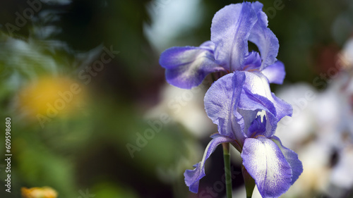 Irideae. Purple iris flowers are blooming in the garden. blue and purple flowers in the garden. macro photo, floral natural background. beautiful flowers close-up. blurred green background
