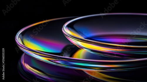 iridescent, glasses, dish, stacked, dark, background, abstract, design, rainbow, colours, vibrant, reflective, surface, sleek, modern, curve, property, shiny, glossy, smooth, luxury, elegant, artistic, beautiful, product, photo, still, life, macro, closeup, texture, light, shadow, composition, style, image, visual, art, commercial, marketing