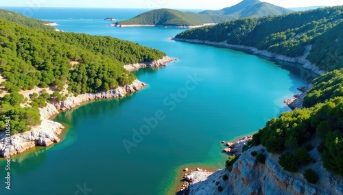 Irregular shaped lake with meandering shoreline, rocky coast, beautiful, environment