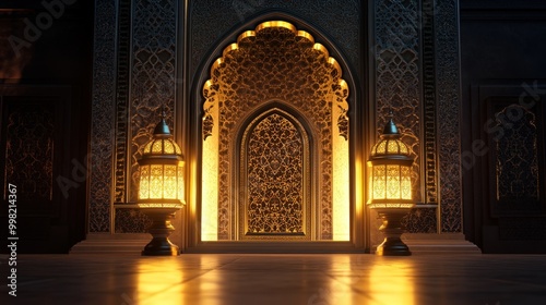 architecture, islamic, lantern, gold, pattern, doorway, ornamental, arabesque, building, design, religious, motif, metal, decorative, embellishment, intricate, detail, carving, grand, ornate, elegance, traditional, cultural, heritage, spiritual, faith, interior, illuminated, light, glow, warm, dark, shadow, floor, surface, symmetry, artistic, artwork, composition