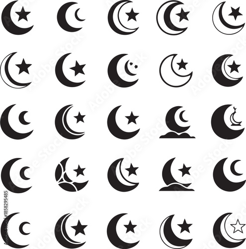 crescent, moon, star, ramadan, eid, islamic, muslim, religion, icon, symbol, vector, illustration, design, set, collection, silhouette, black, solid, bold, minimalist, flat, simple, isolated, background, night, sky, astronomy, celebration, festival, culture, traditional, arabic, middle east, spirituality, holy, month, graphic, element, modern, logotype, signs, greeting, card, invitation, cloud, abstract