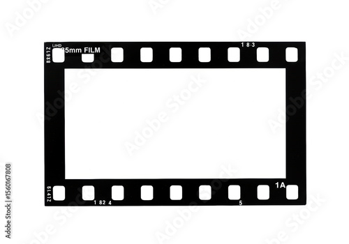Isolated black 35mm film strip frame with white sprocket holes, blank white copy space, and '35mm FILM' text, in photorealistic UHD studio photography on bright white background, concept of vintage