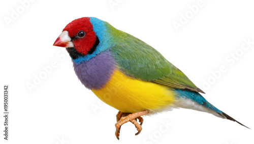 Isolated Gouldian finch with vibrant red, blue, green, purple, and yellow feathers, side view