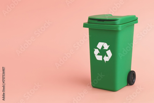 Isolated green recycling bin with black wheels and a white recycle symbol on a coral studio background. Space for text on the side. Clean, commercial image of sustainability