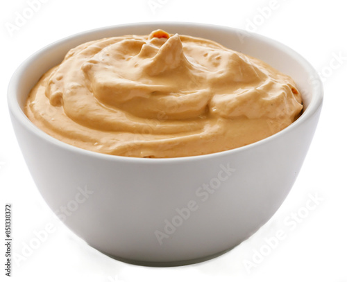 Isolated on a white background, this white bowl features a chipotle aioli created with mayonnaise, chipotle peppers in adobo sauce, garlic, and lime juice. The side and top views are transparent and t