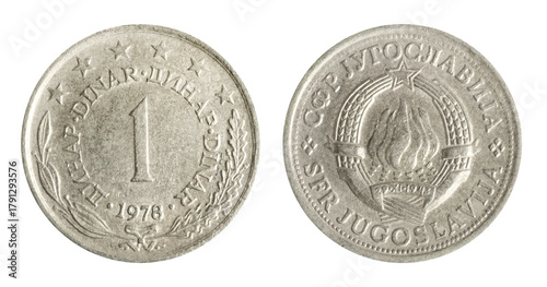 Isolated photo of 1 Jugoslavia dinar 1978 coin obverse and reverse on white background.
