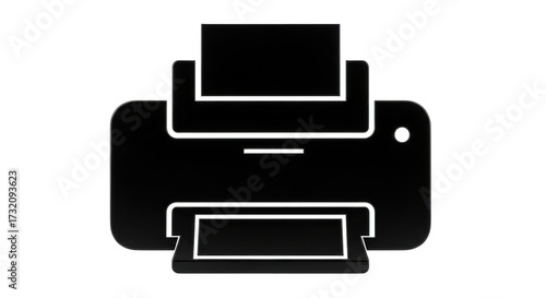 Isolated printer design in black with document in top tray for print from computer or mobile