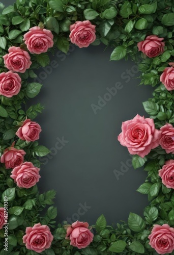 Isolated rose flower, lush green leaves frame, copy space , decoration, card, nature