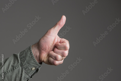 Isolated thumbs up. Man's hand. Green canvas shirt, angling up from corner of frame. Grey backgound. Palm forward.