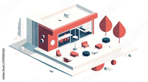 cafes, exterior, modern, design, isometric, patio, tree, eatery, building, architecture, commercial, business, structure, seating, red, minimalist, flat, illustration, vector, graphic, digital, art, concept, minimal, style, view, perspective