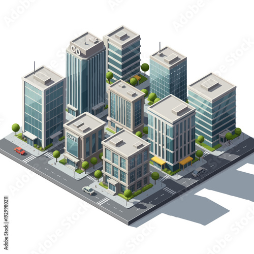 Isometric Cityscape with Modern Office Buildings and Urban Infrastructure.