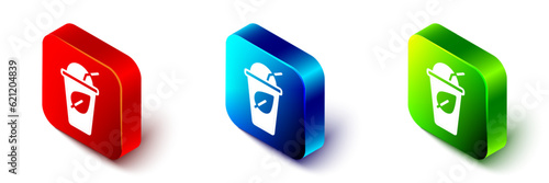 Isometric Cup of tea with leaf icon isolated on white background. Sweet natural food. Red, blue and green square button. Vector