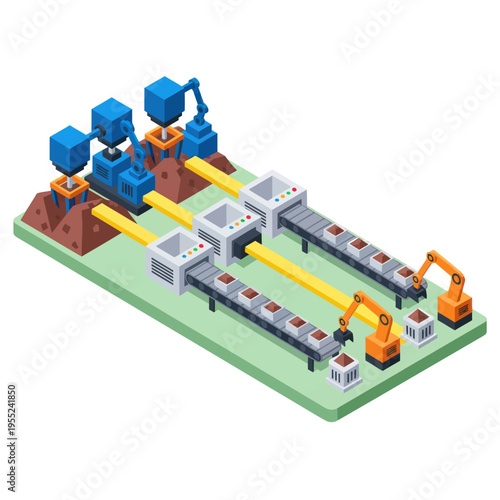 Isometric Factory Assembly Line with Robotic Arms and Conveyor Belts.