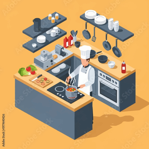 Isometric illustration of a chef cooking in a kitchen.