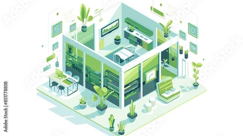 Isometric illustration of a modern apartment with green plants.
