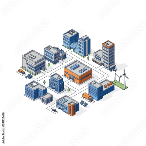 city, urban, smart, modern, isometric, illustration, district, building, architecture, design, concept, business, office, residential, commercial, industry, factory, warehouse, energy, sustainable, renewable, solar, wind, turbine, power, electricity, grid, technology, innovation, future, development, growth, infrastructure, transport, vehicle, car, truck, road, street, path, connection, network, communication, datum, digital, environment, green, environmentally friendly, clean