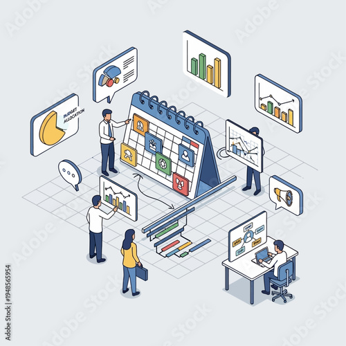 Isometric illustration of a team collaborating on a project, using a calendar and charts for planning and analysis.