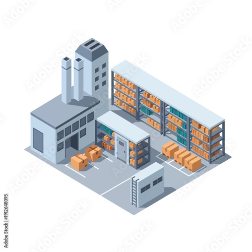 warehouse, storage, industry, logistic, distribution, center, facility, isometric, illustration, three-dimensional, graphic, design, building, architecture, industrial, complex, site, yard, cargo, shipping, transport, delivery, supply, chain, management, operation, business, commerce, trade, product, good, inventory, stock, room, space, area, zone, section, department, work, office, structure, construction, organisation, system, process, technology, modern, contemporary