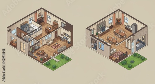 Isometric Illustration of Two Modern House Floor Plans Detailed Interior Design Cozy Home Apartments