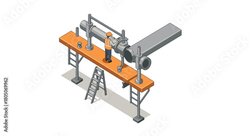 isometric, industrial, men at work, construction, pipeline, inspection, equipment, engineering, safety, platform, machinery, metal, maintenance, job, infrastructure, project, labor, worksite, technician, architecture, structural, ladder, orange, uniform, hard hat, pipe, assembly, component, framework, mechanical, support, beam, system, workshop, tool
