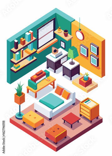 Isometric modern bedroom interior with bed, nightstand, and wardrobe. Contemporary furniture layout in cozy home space, elegant minimalist decor in stylish private room.