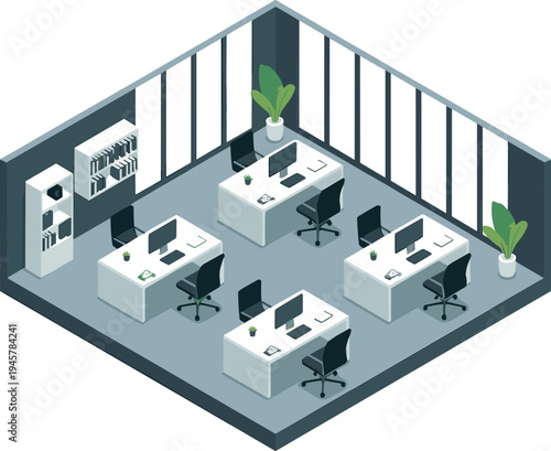 Isometric modern office workspace with desks, computers, chairs, plants and shelves, corporate workplace interior design vector illustration