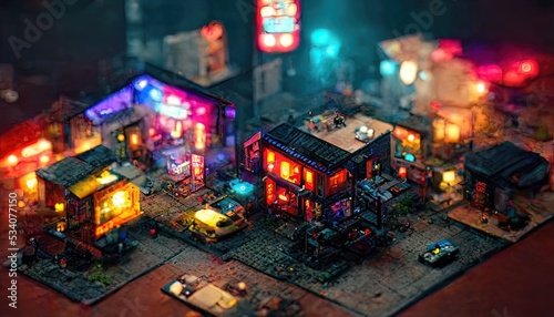 Isometric neon night city. City navigation, street map. Dark streets, illuminated signs, advertising, city roads and buildings. 3D illustration