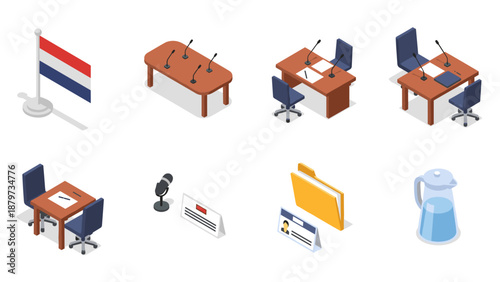 isometric, office, conference, table, chair, flag, microphone, folder, badge, pitcher, meeting, professional, desk, setup, equipment, workspace, chair, document, identification, flag pole, beverage, organisation, notebook, work, appointment, layout, arrangement, preparation, furnishing, corporate, environment, object, scene, business