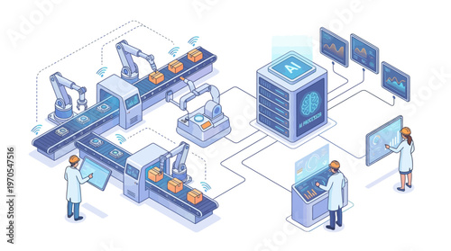 Isometric Smart Factory with AI-Powered Robotics Automation, Engineers Monitoring Industrial IoT Production Line, Digital Manufacturing and Industry 4.0 Technology
