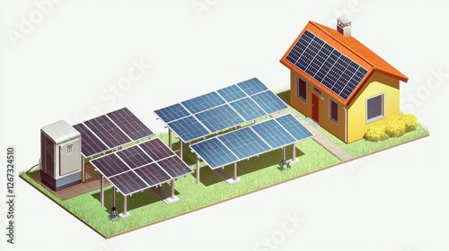 Isometric Solar Panels on House with Storage, Sustainable Energy