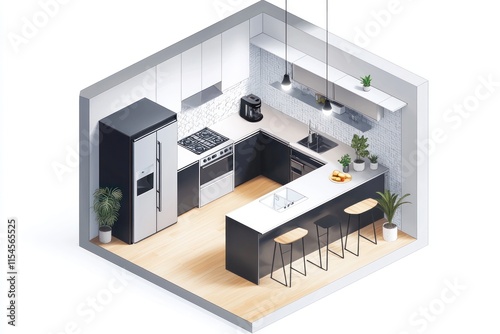 isometric, view, kitchen, interior, sleek, appliance, minimalist, design, modern, cabinetry, three-dimensional, rendering, house, home, architecture, building, office, construction, plan, vector, apartment, room, furniture, icon, business, computer, illustration, project, table, model, technology, residential