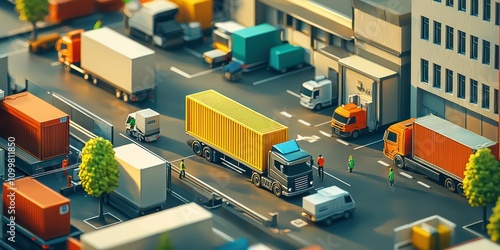 Isometric view of a logistics center, with trucks, loading docks, and delivery vans in action.