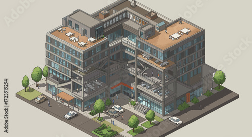 isometric, building, office, architecture, modern, city, urban, design, exterior, structure, facades, window, glasses, construction, corporate, business, commercial, environment, tree, car, street, sidewalk, landscape, illustration, artwork, drawing, digital, style, perspective, view, complex, grey, beige, orange, parking, driveway, plant, square, block, road, path, entrance, roof, detail, art, geometric, pattern, day, light