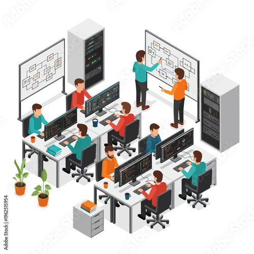 isometric, office, tech, technology, developer, computer, server, team, collaboration, whiteboard, programming, coding, workplace, workspace, illustration, design, network, datum, software, engineer, desk, people, meeting, brainstorming, strategy, planning, solution, innovation, startup, business, corporate, modern, digital, cyberspace, system, administration, support, management, analysis, development, project, task, monitor, keyboard, chair, plant