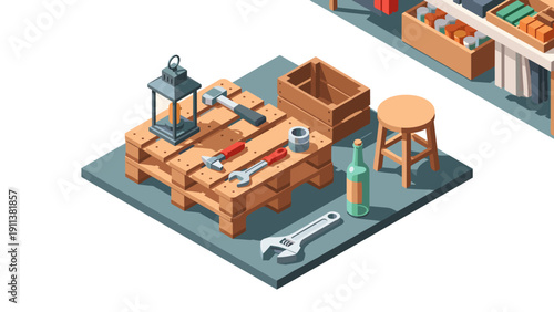 isometric, workshop, tool, wooden, furniture, arrangement, lantern, hammer, wrench, stool, pallet, crate, bottle, shelf, decor, interior, carpenter's shop, hardware, bricolage, repair, industrial, maintenance, rudimentary, practical, functional, garage, workspace, organisation, detailed, realistic, structured, assembly, design, shelf, material, neat, sturdy