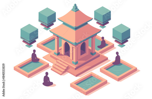 isometric, zen, temple, meditating, tranquil, architecture, cube, structure, sanctuary, spirituality, meditation, peace, calm, design, art, symmetric, harmony, cultural, peaceful, serenity, balance, illustration, graphic, geometric, perspective, spiritual, calmness, figure, relaxation, to rest, stillness, quiet, silence, retreat, mindfulness, contemplation, pastel, step, pagoda, shape, pattern, layout, arrangement, configuration, aesthetic