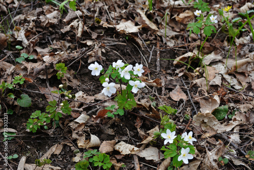 Isopyrum thalictroides blooms in the wild in the forest.