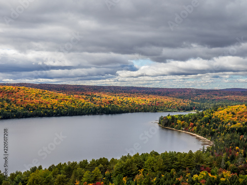 It is a picture of red maple taken in Canada. This is a picture of autumn leaves seen from Algonquin State Park in Ontario, Canada. There are colorful autumn leaves around the lake.