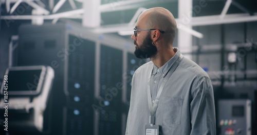engineer, specialist, male, man, professional, walking, checking, working, adult, badge, equipment, server room, networking, cyberspace, storage, modern, hardware, corporate, technology, security, troubleshooting, focused, inspecting, integrity, data protection, surveillance, compliance, information technology, information technology