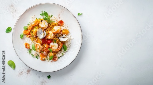 Italian-inspired seafood paella with rice and fresh shellfish, garnished with herbs, in a minimalist top-view layout.