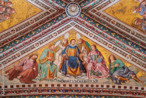 italy, orvieto, duomo, cathedral, religious, religion, catholic, church, detail, architecture, architectural, building, historic, historical, history, famous, landmark, travel, tour tourism, umbria, heritage, unesco, site, renaissance, historical building, ornate, ceiling, vaulted, vault, fresco, painting, close, up, art, artwork, decorative, decoration, gold, gold, mosaic, figure, robe, saint, army, group, latin, inscription, script