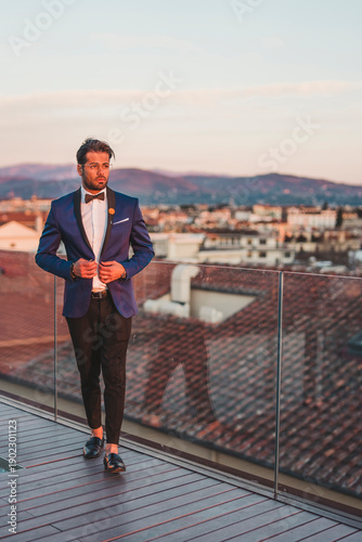 italy, firenze, stylish, man, roof, terrace, sunset, 1, copy space, people, adult, male, suit, coat, cultivated, white, shirt, well-dressed, fashionable, attitude, leather, shoe, evening, mood, man, fashion, self-confidence, elegance, precious, cool, walking, goggles, bow, attaching, attractive, rooftop, sky, wealth, light, dusk, outdoors, model, tuscany, jacket, atmosphere, caucasian, style, twilight