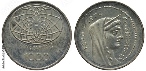 Italy Italian silver coin 1000 one thousand lira 1970, subject Centennial of Rome as capital, emblem above value, ancient woman right to dates,