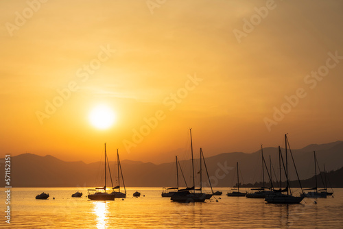 Italy, Veneto, Bardolino, Silhouettes of sailboats floating in Lake Garda at sunset