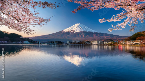 Japan Mount Fuji reflected in the still waters of Lake Kawaguchi during cherry blossom season
