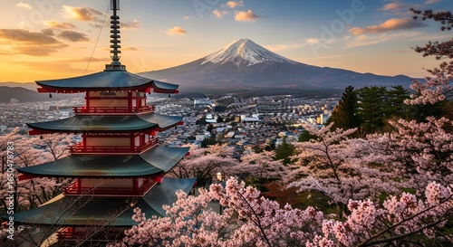 Japanese Pagoda Temple with Mount Fuji and Cherry Blossoms