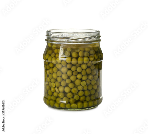 Jar of pickled peas isolated on white