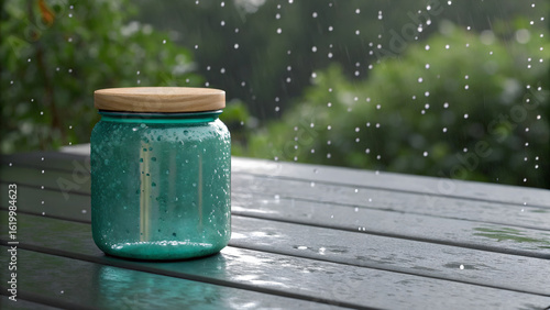 jar, rain, outdoors, nature, wood, water, table, green, wet, liquid, droplet, condensation, environment, weather, surface, refreshing, closeup, tranquil, dew, glasses, lid, rainy day, fresh, clear, blurred background, season, garden, macro, relaxation